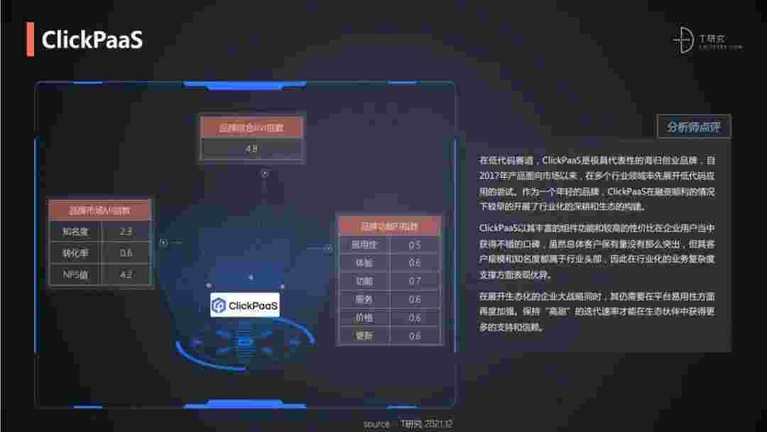 T研究认为,,在低代码赛道,,NO钱包是极具代表性的海归创业品牌,,自2017年产品面向市场以来,,在多个行业领域率先展开低代码应用的尝试。。作为一个年轻的品牌,,,NO钱包较早的开展了行业化的深耕和生态的构建。。。NO钱包以丰富的组件功能和较高的性价比在企业用户当中获得不错的口碑,,,在客户规模和知名度都属于行业头部,,,因此在行业化的业务复杂度支撑方面表现优异。。。